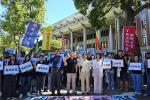 多位原住民教师、民代及团体13日齐聚教育部大门口,要求教育部课审会尽快依照《国家语言发展法》修订12年国教课程纲要总纲,将原民族语纳入教育部部定必修。(杜宜谙摄影)